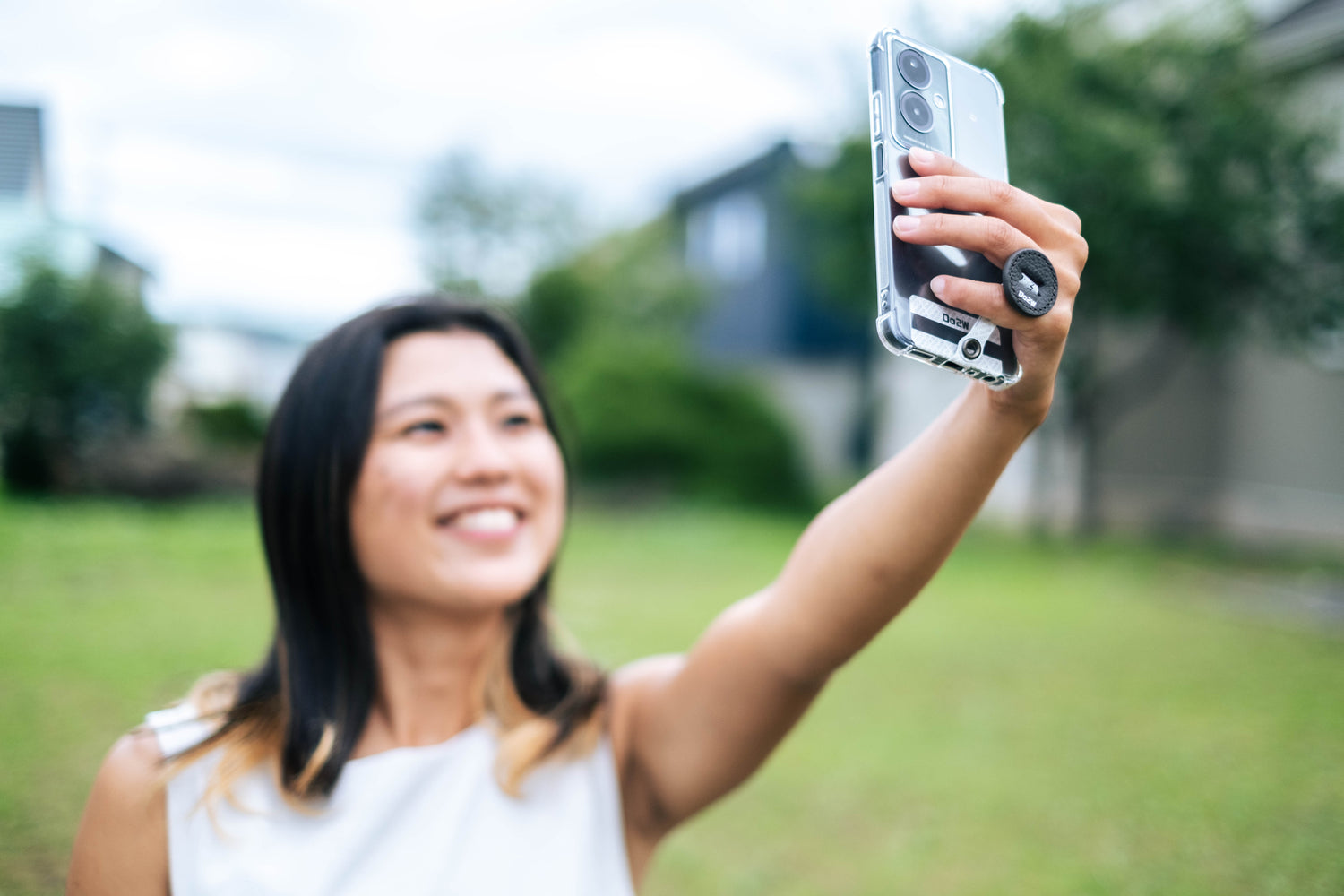 SYANTOのバッジ部分を指で挟むことで、指に力を入れなくても自然とスマホを保持でき、スマホを落下させる可能性を大幅に減らしました。